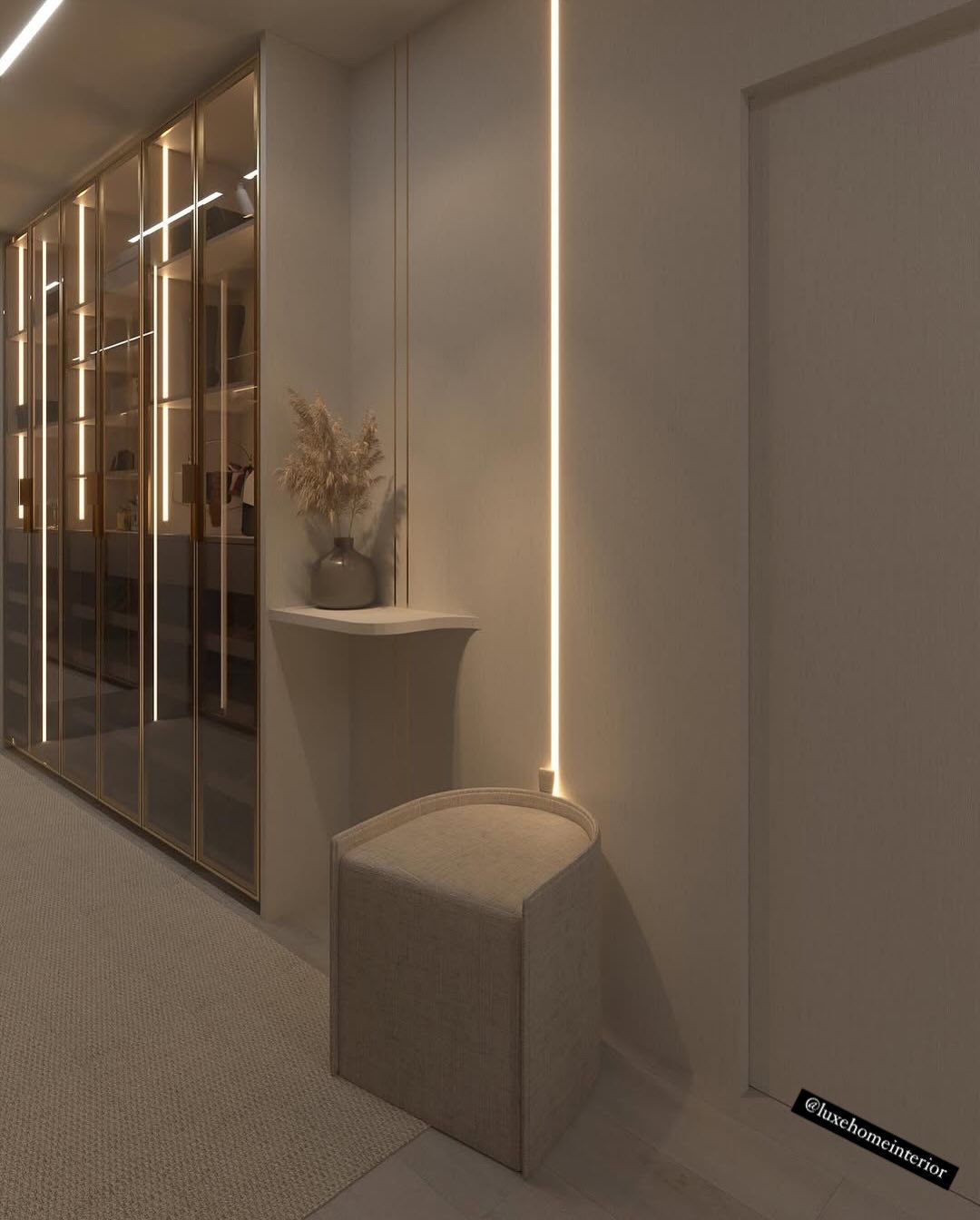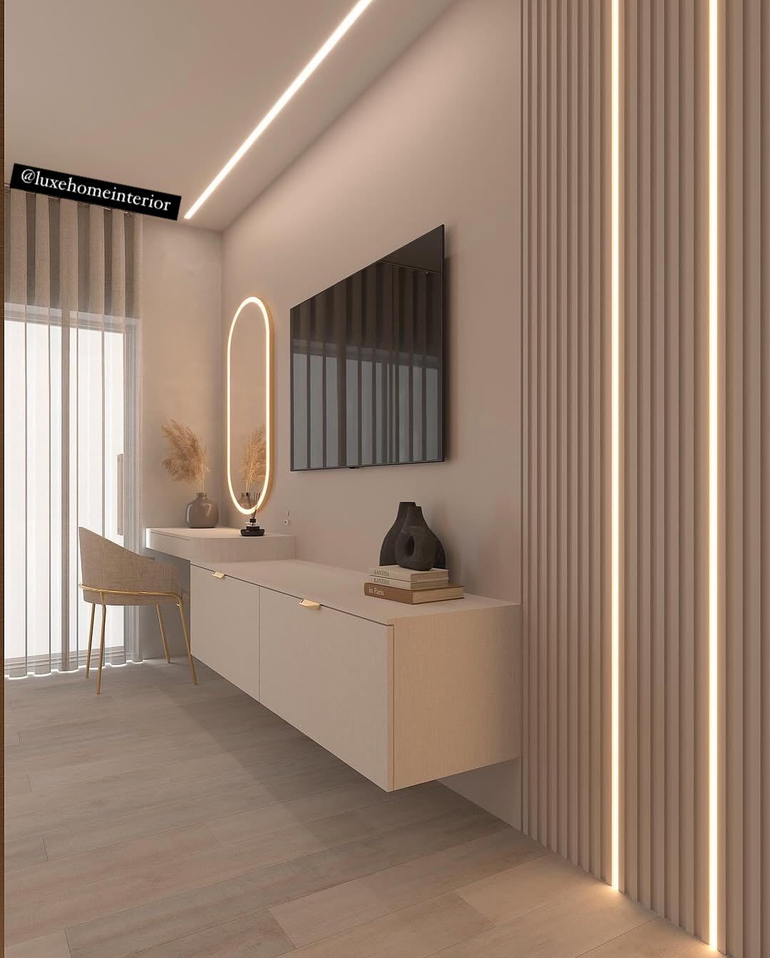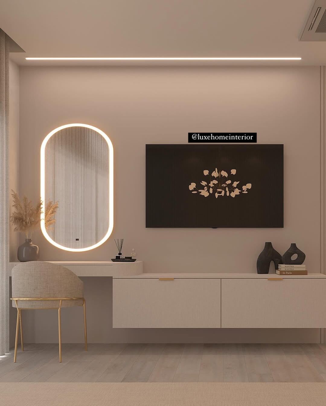 A villa that needed a contemporary, stylish, and soothing interior design solution. Our team used a neutral palette with gold accents and added custom-built furniture.